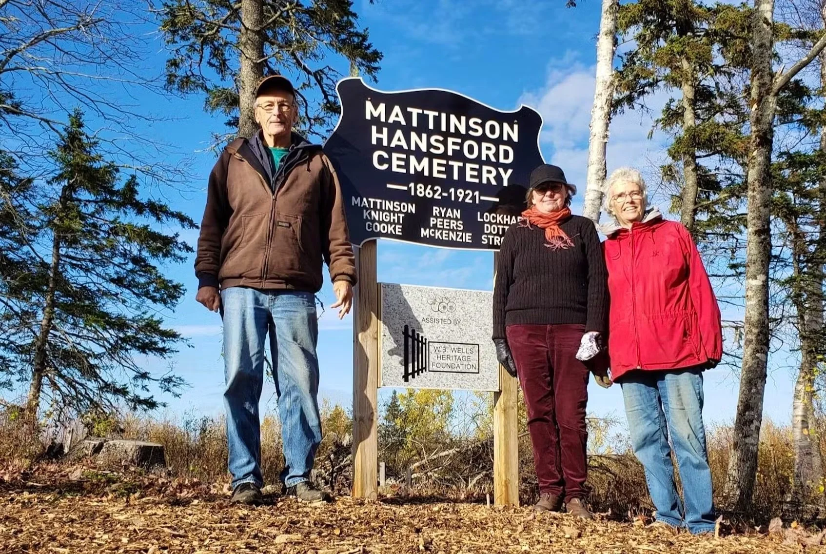 At a Mattinson Family Reunion in Oxford, NS, in 2002, a tour of local cemeteries sparked the desire among 5th generation cousins to preserve the overgrown Mattinson Cemetery on Hansford Road. In October 2015, a visit to the deteriorating cemetery led to the decision to restore it before further damage occurred. After attending a WB Wells Foundation Workshop in Amherst, valuable information and financial assistance for the restoration project were obtained. Following on-site meetings with experts and obtaining a Quit Claim Deed, the Not-for-Profit Mattinson Hansford Cemetery Society was formed, and funding was secured. Restoration work began in December 2016.